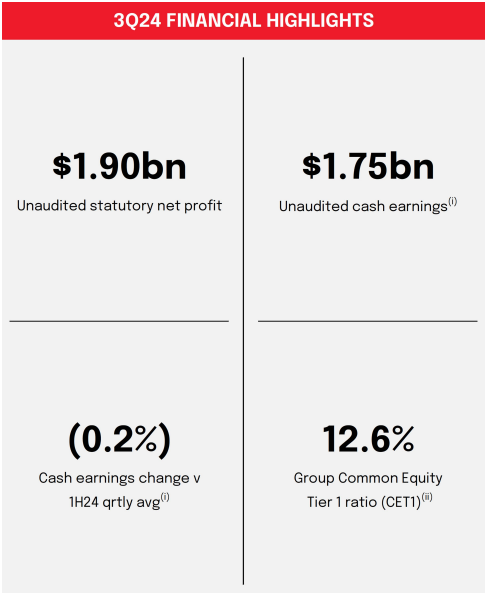 "The economic environment, including persistent inflationary pressures, is challenging for our customers and we are here to help them. While most customers are proving resilient, not unexpectedly we have seen asset quality deteriorate further in 3Q24. It is essential we keep our customers and our bank safe. Liquidity and collective provision coverage are healthy. Capital remained strong over the quarter supporting the continuation of our on-market share buy-back.